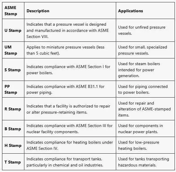 Here is a comprehensive breakdown of the various ASME stamps based on their usage, governing code sections, and applications: